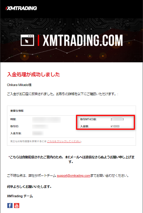 上記の「入金処理が成功しました」という確認メールの